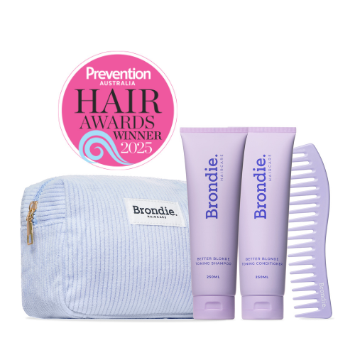 This fabulous bundle includes a free comb and Brondie travel bag - valued at a combined total of $123. Plus enjoy free shipping Australia-wide. Dreamed up by a hairdresser, soon-to-be loved by you.Meet our multi-tasking Blonde Toning Better Bundle ā scientifically formulated with technology ReviScalp⢠to promote a healthy scalp and brighter hair. Scientifically proven ingredients are the root of Brondie.Proudly Australian Made, 100% Vegan and cruelty free, our Blonde Toning Better Bundle Cleanses, Hydrates and Repairs even the most damaged blonde, bronde and grey hair from first wash.It wonāt stop there. If youāre also dealing with dandruff or an irritated and oily scalp itāll rebalance and restore calm.We love brighter, healthier-looking blonde hair. We also love healthy scalp. When you wash your strands with Brondie you can enjoy both!